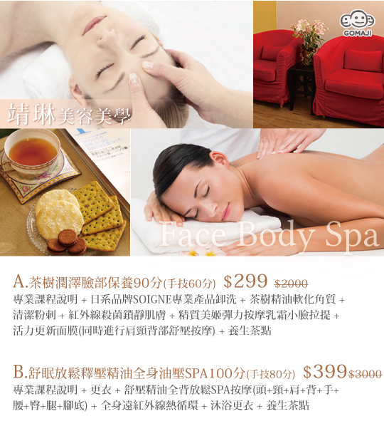 專業課程說明 + 日系品牌SOIGNE專業產品卸洗 + 茶樹精油軟化角質 + 清潔粉刺 + 紅外線殺菌鎖靜肌膚 + 精質美姬彈力按摩乳霜小臉拉提 + 活力更新面膜(同時進行肩頸背部舒壓按摩) + 養生茶點