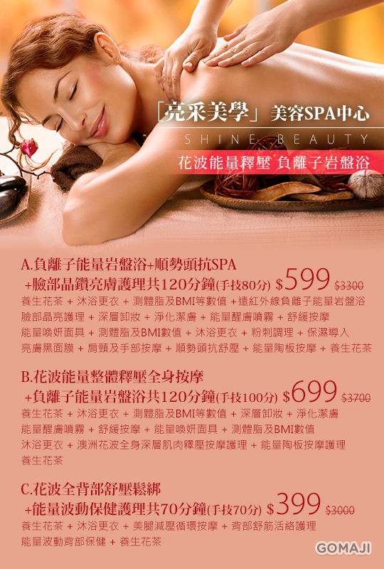 只要399元起,即可享有【亮采美學美容SPA中心】A.負離子能量岩盤浴+順勢頭抗SPA+臉部晶鑽亮膚護理共120分鐘(手技80分) / B.花波能量整體釋壓全身按摩+負離子能量岩盤浴共120分鐘(手技100分) / C.花波全背部舒壓鬆綁+能量波動保健護理浴共70分鐘(手技70分)